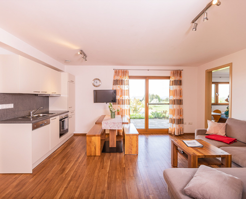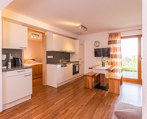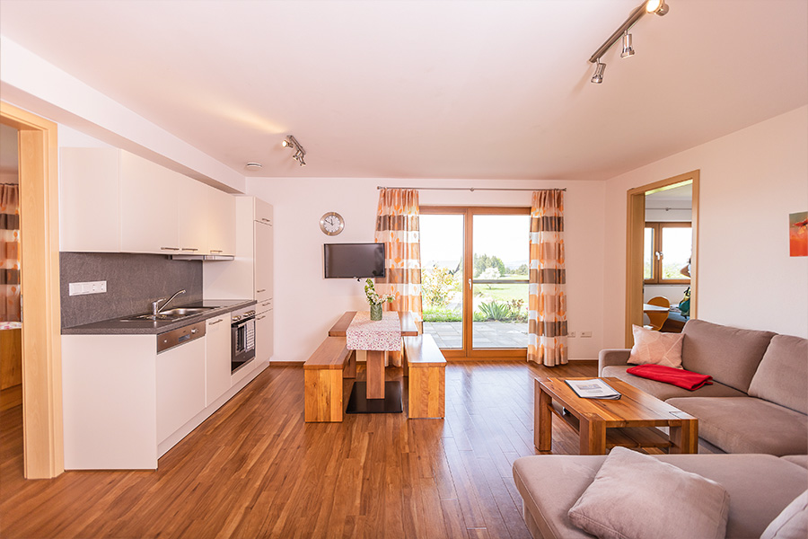Die Ferienwohnung Seeblick hat 74 m² Wohnfläche und befindet sich im Erdgeschoss. Sie hat eine großzügige Terrasse mit Blick auf unsere grünen Wiesen sowie herrlichem Bodenseeblick mit Alpenpanorama. Die Wohnung hat einen offenen Koch- / Ess- und Wohnbereich mit voll ausgestatteter Einbauküche, Fernseher, Stereoanlage, großzügige Garderobe mit Ganzkörperspiegel im Flur, Bad mit Dusche, WC, Waschbecken, Waschmaschine, separates WC und 2 Schlafzimmer. Im Kinderzimmer kann aus einem Bett ein Lattenrost als Schublade mit Matratze ausgezogen werden, so dass auch eine Familie mit 3 Kindern die Ferienwohnung beziehen kann. In allen Räumen haben sie eine elektrische, kontrollierte Be- und Entlüftung. Zum entspannen haben sie eine überdachte Terrasse mit Sitzgelegenheit zum Essen (Tisch und 4 Stühle) und 2 Sonnenliegen!